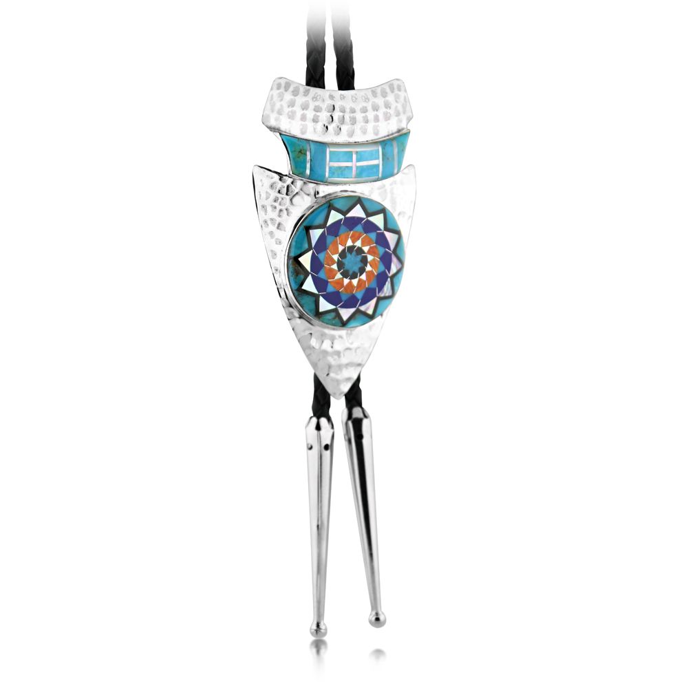 Bolo Material: Sterling Silver, with Mother of Pearl, Turquoise, Lapis, Black jet, Spiny Oyster Shelll and Black Leather
