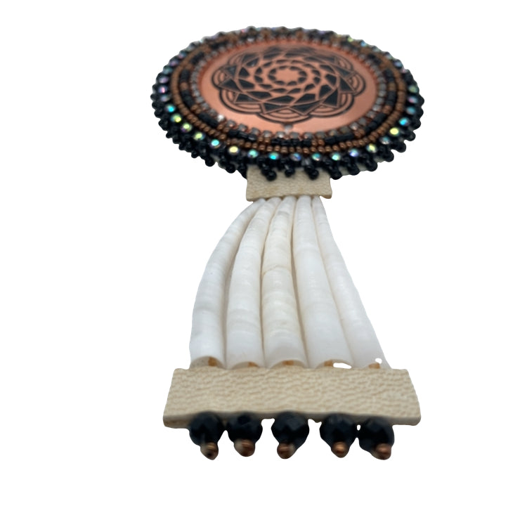 These expertly crafted earrings feature authentic dentalium shells arranged in a drop configuration, complemented by precision beadwork that demonstrates traditional artisanal technique. The dentalium, a prized shell historically valued in indigenous cultures, pairs with the Copper Pinecone Patchwork creates a refined accessory with cultural significance and timeless appeal.