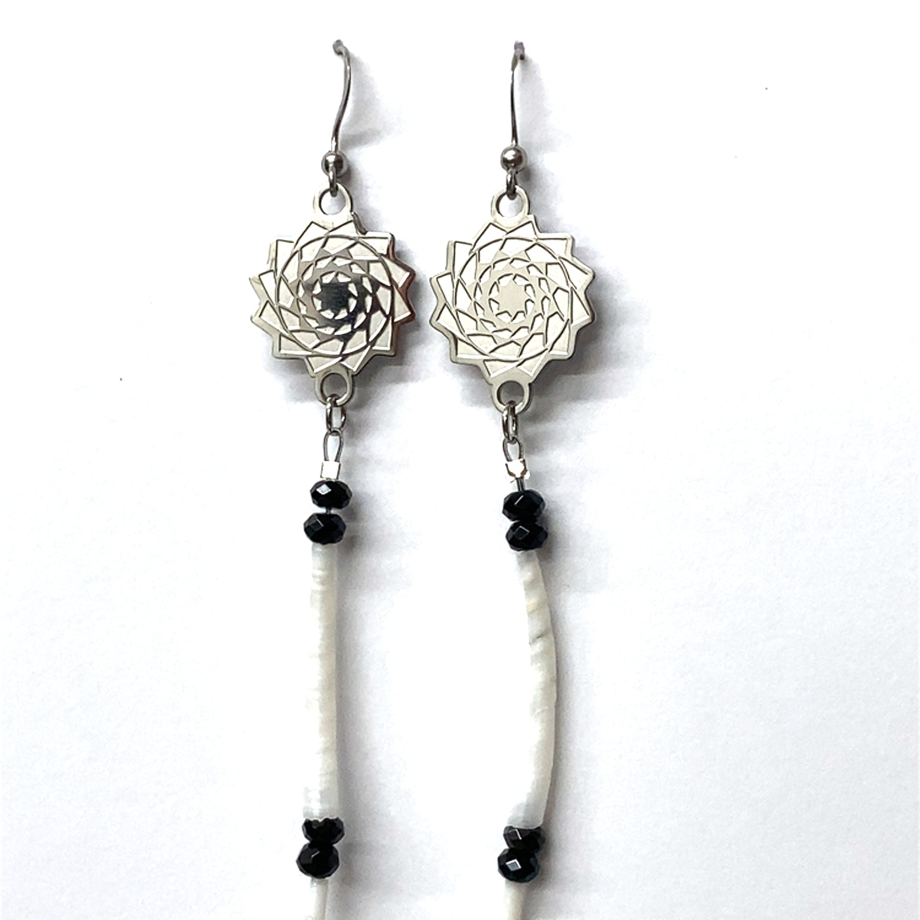 Handcrafted by Cyna's indigenous artisans, these 6 to 7 inch earrings showcase the iconic Pinecone Patchwork pattern with gleaming dentalium shells, smoky black agate, and faceted onyx beads. The playful mix of textures and tones creates a look that's both sophisticated and fun, perfect for anyone who loves wearing art that honors tradition. Each pair tells a story of heritage and skilled craftsmanship you can feel good about. Keep our heritage Alive.