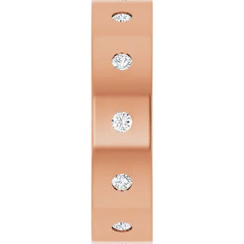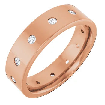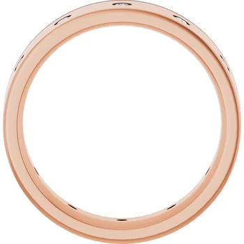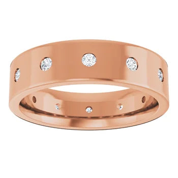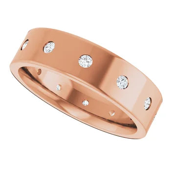 Crafted with 14K rose gold and paired with sparkling 2mm diamonds, this wedding band is the perfect symbol of love and commitment. The timeless design and quality materials ensure a lasting piece of jewelry for your special day and beyond. Elevate your love with this stunning wedding band.