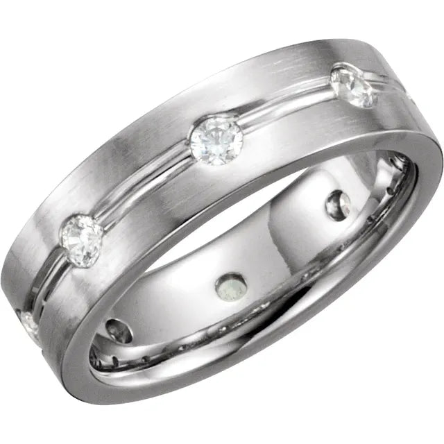 Crafted in shimmering 14K white gold, this round wedding band sparkles with 2.5mm round SI1, G color diamonds. Its timeless 6mm width adds elegance to any finger and the diamonds add a touch of luxury. Perfect for any special occasion or daily wear, this band is a symbol of everlasting love