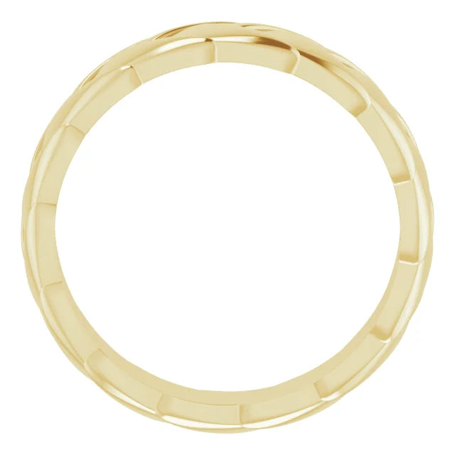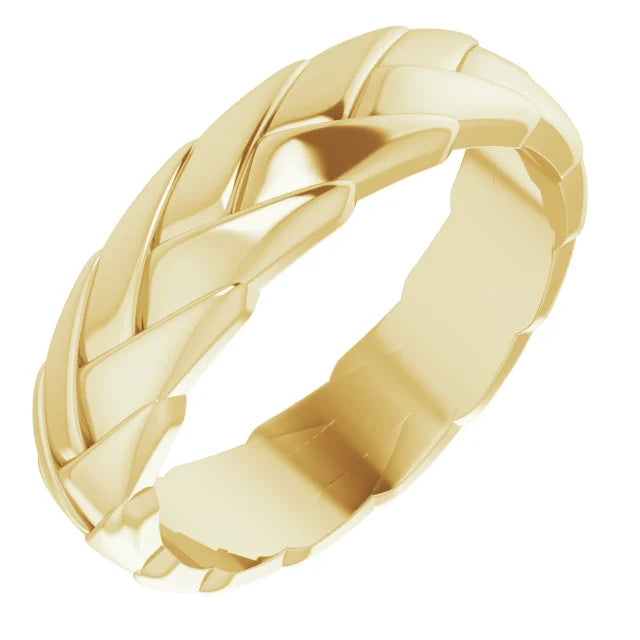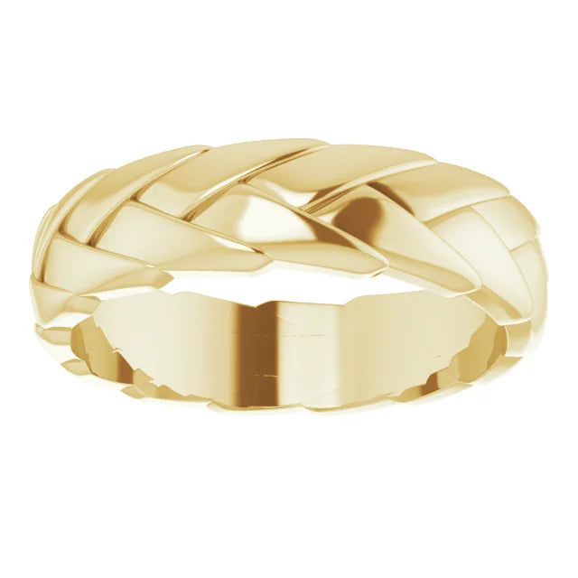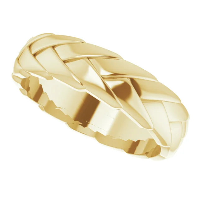 Crafted with expertise and elegance in mind, this 14K yellow gold braided wedding band is the perfect symbol of your love and commitment. With its durable 6mm width, it offers a timeless and luxurious look that will last a lifetime. Celebrate your special day with this exquisite piece. You will not be disappointed.