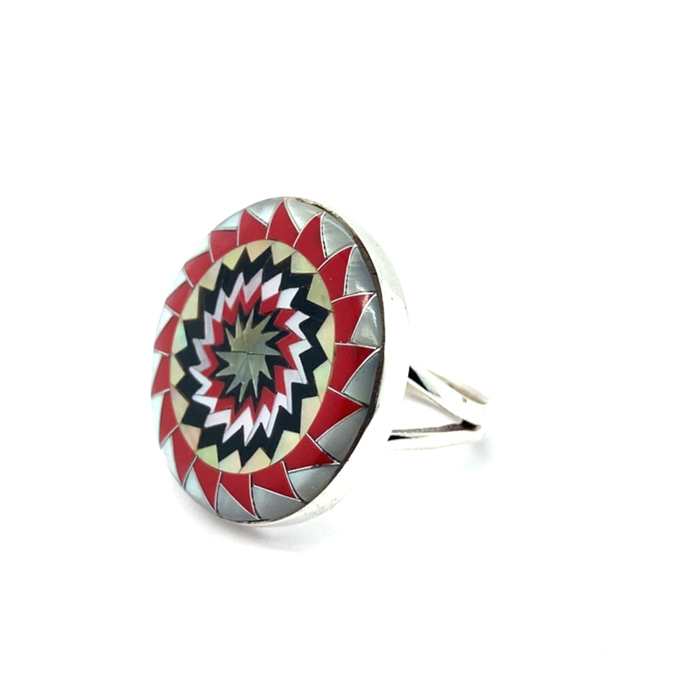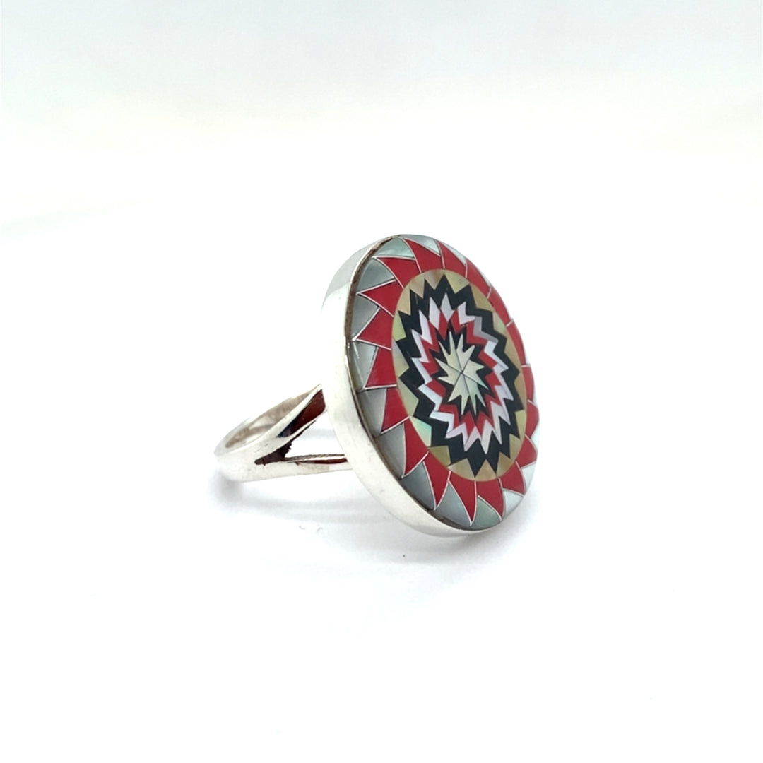 Pinecone Patchwork Inlay MOP Red Turquoise Yellow Ring Tribal
