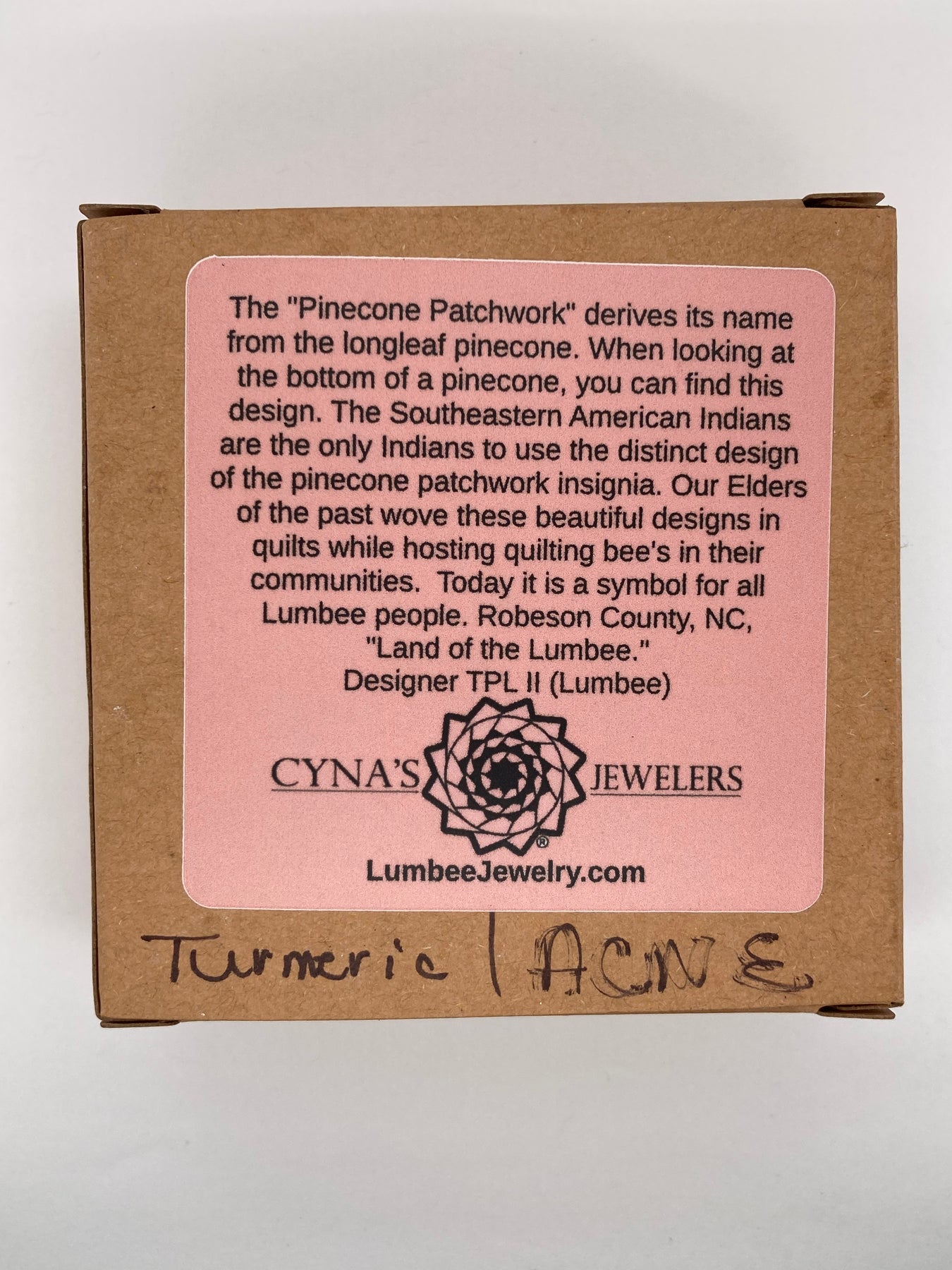 Each bar comes with a display box and the Pinecone Patchwork story, great gift to share our Lumbee heritage!