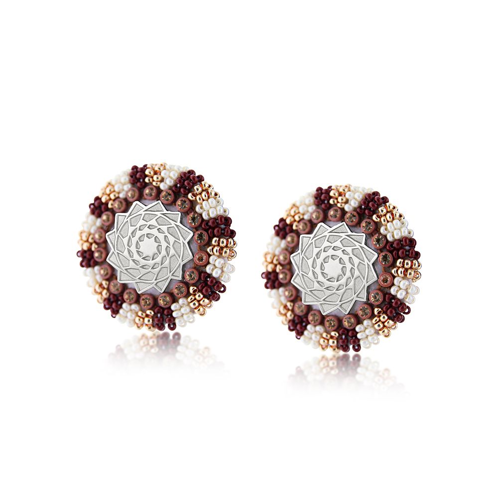 Beautiful Pinecone Patchwork Small Round Earrings Accented with Applique Style Beadwork.