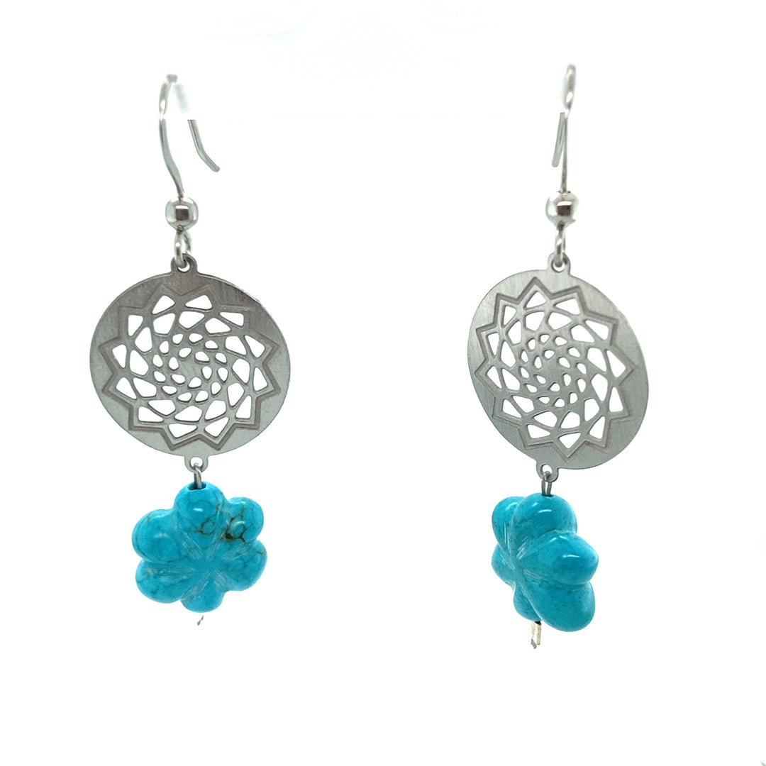 Satin finish stainless Pinecone Patchwork disc earrings with dangle flower turquoise drops.
