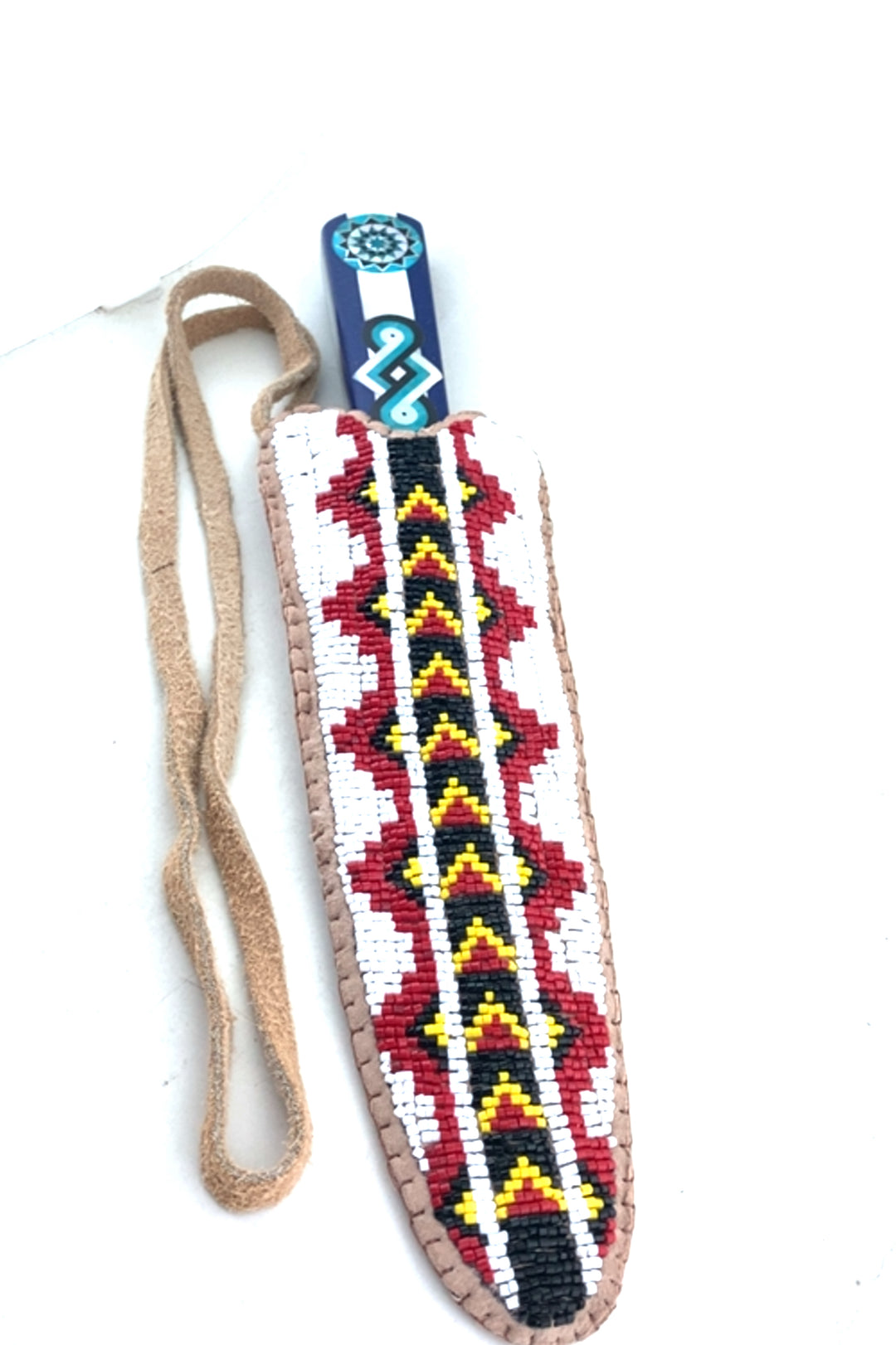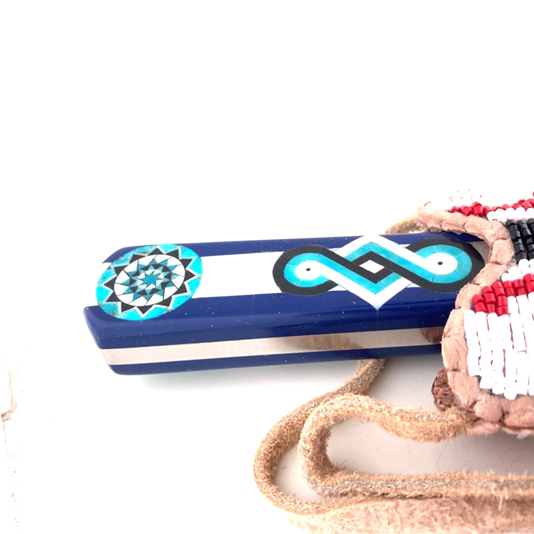 With over a year in design and making, we are happy to unveil this one-of-a-kind Southeastern Woodlands Neck Knife. Handle inlaid with the Pinecone Patchwork (White Mother of Pearl, Black Buffalo horn, Turquoise, Man-made Royal Blue Lapis with metal flake and Turquoise) with an exquisite sheath hand-beaded on strong soft Elk hide (inner sheath is lined with hard leather). Beadwork featuring a beautiful red, white, yellow and black tribal pattern.