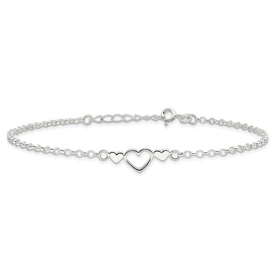 Sterling Silver 9inch Plus 1 in ext. Polished Triple Heart Anklet.