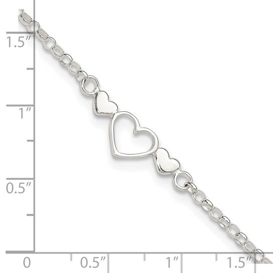 Sterling Silver 9inch Plus 1 in ext. Polished Triple Heart Anklet
